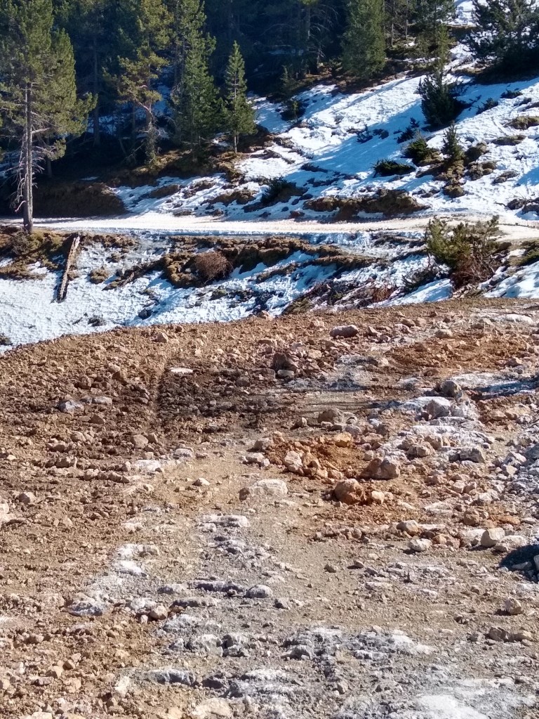 Die Pistenraupen haben die oberen 10 cm aufgewühlt, so dass es ein weiches Gemisch ist. Mit Mühe ist das fahrbar. Das Schmelzwasser macht das aber zu einem Schlamm, der sich zwischen Reifen und Schutzblech verklemmt und von dort auf die Kette und das Schaltwerk fällt. Richtig fein!!!