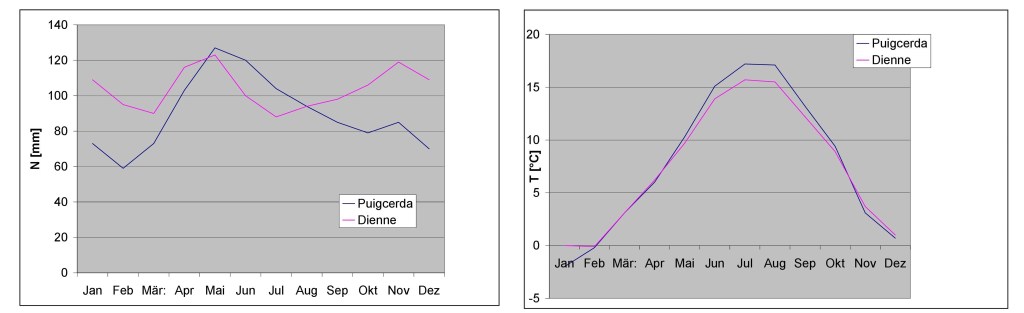 Die beiden Abb. oben zeigen Niederschlags- und Temperaturverläufe. Puigcerda liegt in den Pyrenäen und Dienne im Gebirgsstock des Pas Peyrol. Beide Orte liegen auf ca 1000 m Höhe. Das ist wesentlich, denn mit zunehmender Höhe nimmt auch der Niederschlag stark zu und die Temperatur ab. An beiden Orten ist die Temperatur im Winter etwa gleich. Entscheidend scheint mir der Niederschlag zu sein. Er ist in der Auvergne in den Wintermonaten ca. 30 bis 40 mm höher als in den Pyrenäen M. E. ist das der Gund.