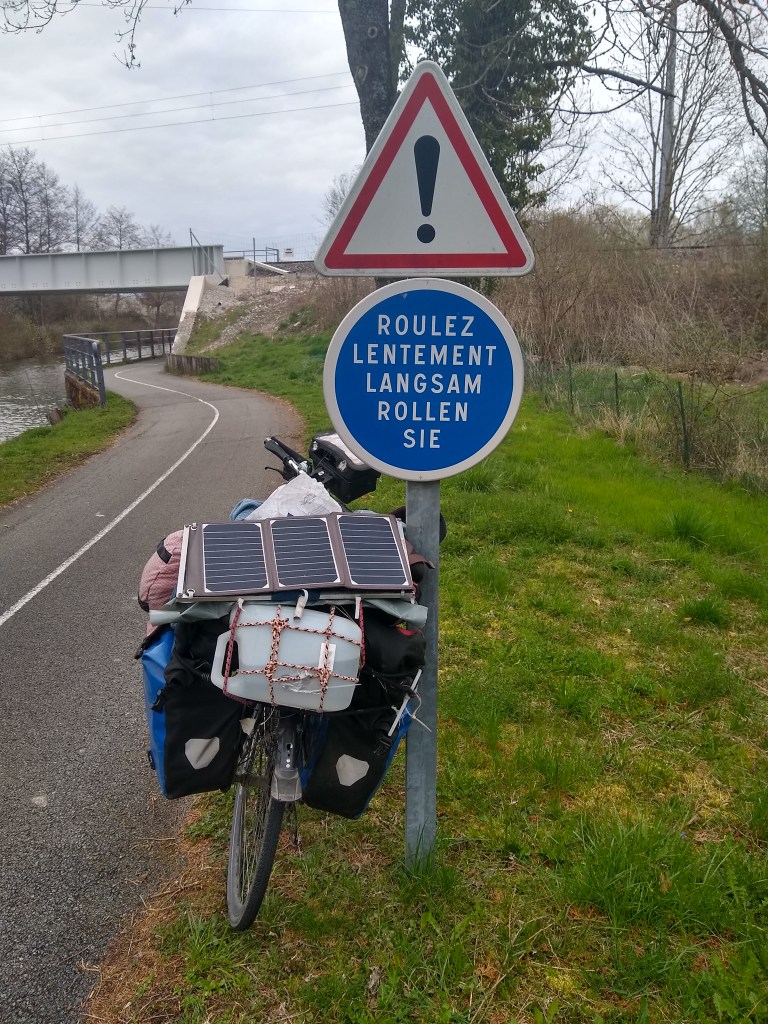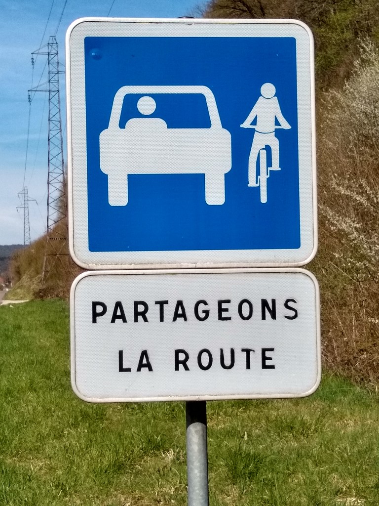 Lasst uns die Straße teilen. Dieses Schild habe ich sehr oft gesehen. Im Gegensatz zu Norddeutschland wurde ich hier nie angehupt. Ich fahre ein Stück auf dem Eurovelo 6 Atlantik-Schwarzes Meer. Offensichtlich radeln hier so viele Deutsche, dass ungewöhnliche Schilder französisch und Deutsch sein müssen.