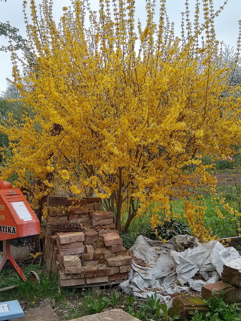 Zuhause begrüßte mich der blühende Forsythienstrauch.