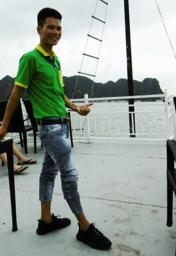 Er fiel sofort durch sein gutes Englisch auf. Uns 6 Europäer unter 50 Asiaten hat er aufs Beste separat informiert. Seine freundliche Ausstrahlung war ausgesprochen einnehmend. Auf der Rückfahrt aus der Halongbucht hatte er nichts mehr zu tun und gesellte sich zu uns. Offensichtlich hatte er Interesse daran, sich mit uns zu unterhalten.