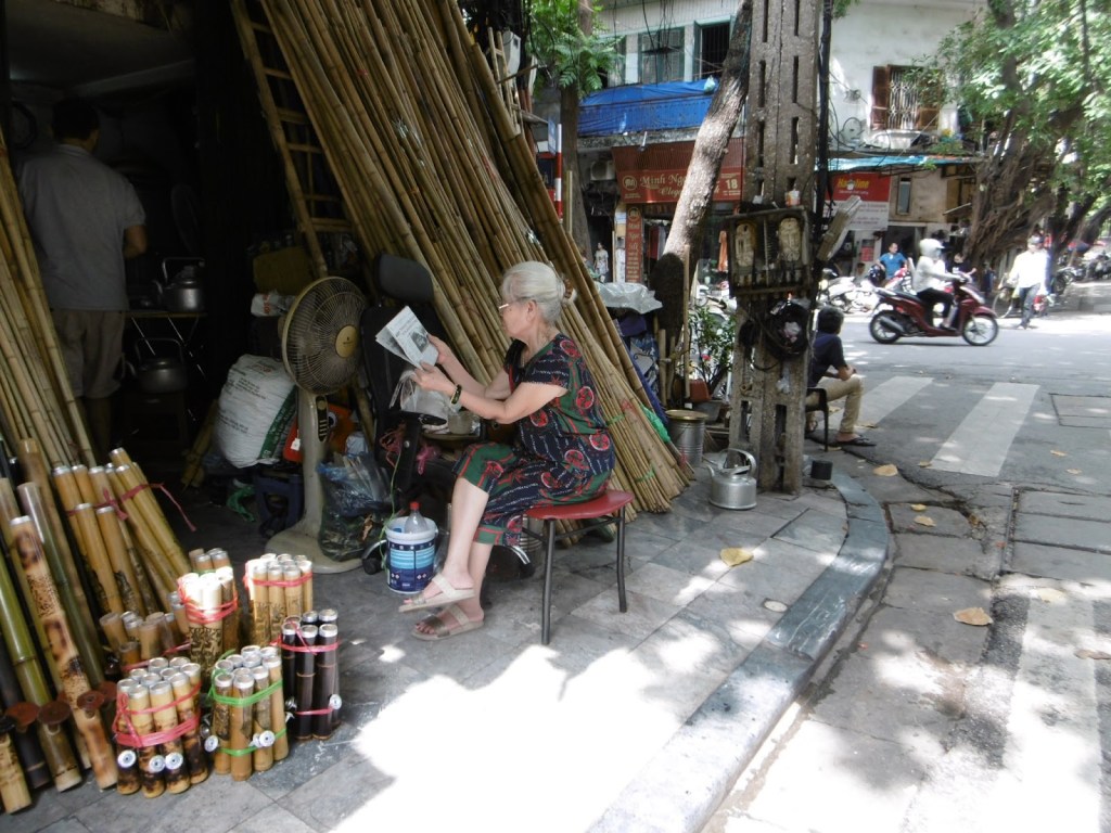 Wir schlenderten durch die Handwerkergassen. Bambus ist ein universelles Material: Häuser, Möbel, Leitern und hier Pfeifen werden daraus gemacht. Ungewöhnlich, dass frau Zeitung liest.