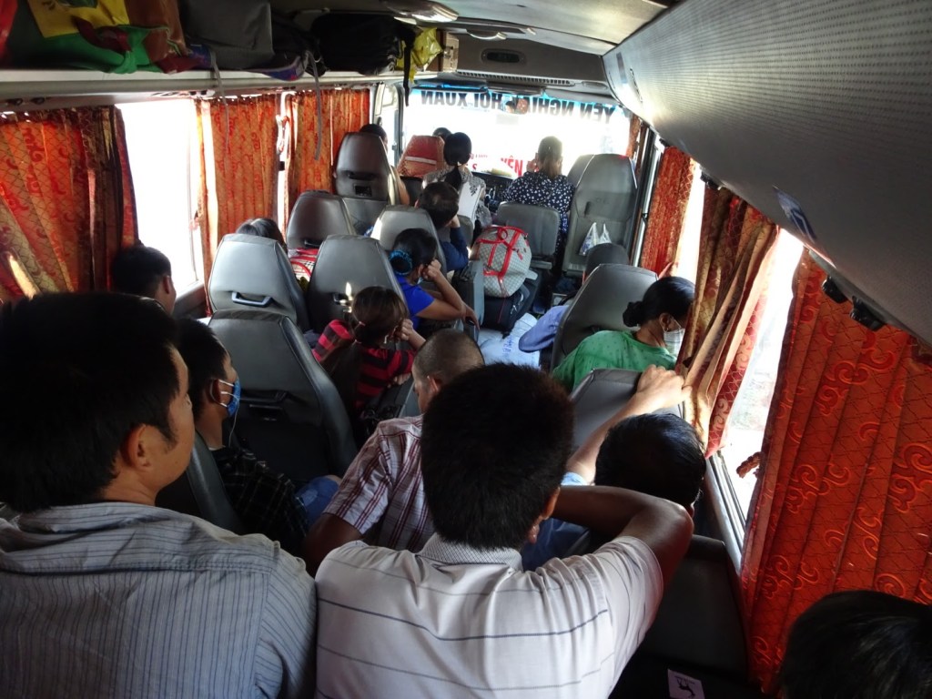 Jetzt waren wir in Vietnam angekommen. Außer uns saßen 30 vietnamesische Passagiere im Bus mit 23 Sitzplätzen und hatten eine Menge Gepäck. Mit eingeklemmten Beinen konnten wir uns kaum bewegen. Nach einer Weile schmerzten nahezu alle Glieder.