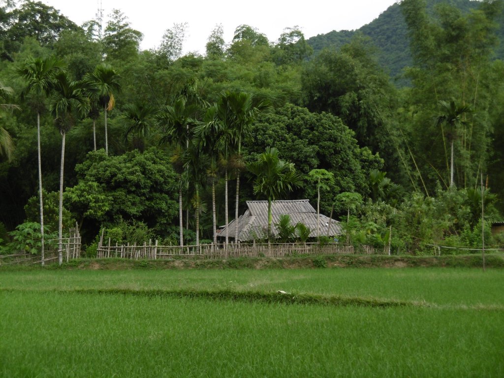 Wir schliefen im Oberstock mit Blick auf die Reisfelder. Die Wände waren mit Holz verschalt, der Boden wie üblich aus dünnen Bambusstreifen mit einem Teppich aus Schilf belegt. Unter einem Moskitonezu schliefen wir auf Schaumgummimatratzen sehr gut bis uns die Hähne weckten.