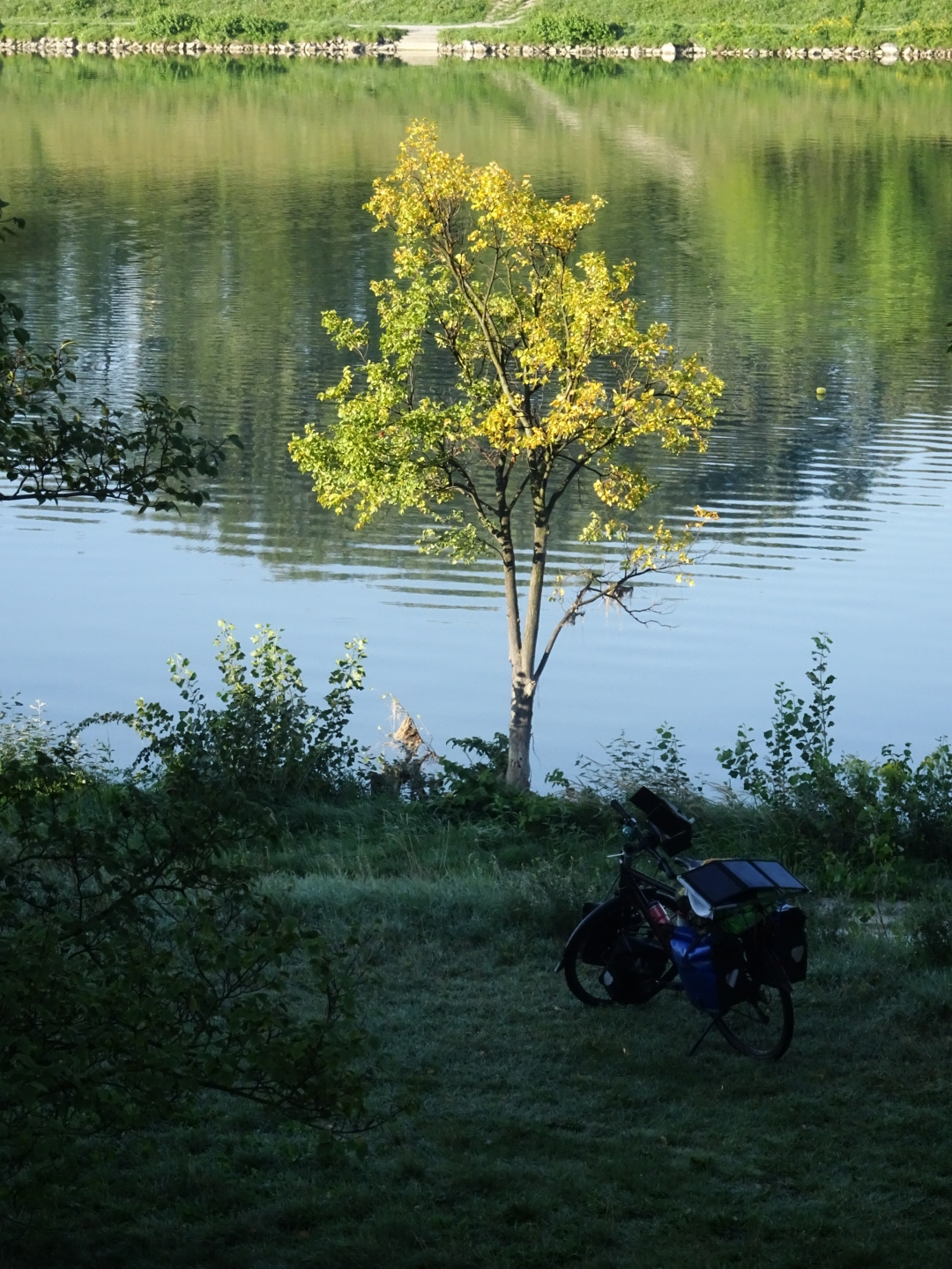Statt um 19 Uhr kam ich um 22 Uhr in Wien an und machte eine Nachtfahrt aus der Stadt hinaus und fand an der Donau einen schönen Zeltplatz. Auf die Brücke über die Donau und wieder runter fuhr ich über tolle Kreisel. So aufwändige Bauwerke für Radler findet man in Deutschland nicht. In sachen Verkehrswende machen uns die Österreicher was vor.
