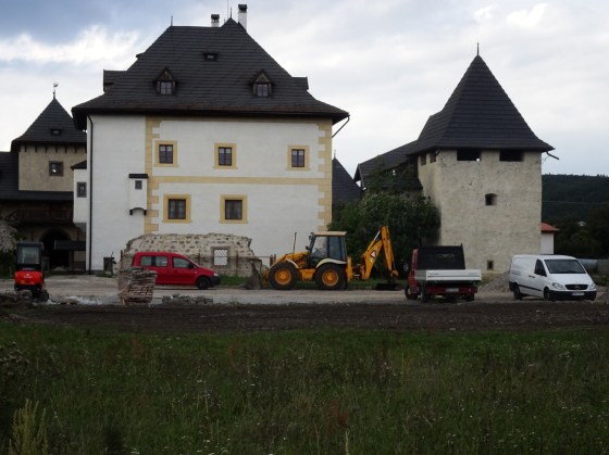 Als ich auf dieses Dorf zufuhr, hat mich zunächst der rechte Turm fasziniert. Die Lage der oberen Fenster direkt unter dem Trauf macht ihn spannend. Und ich habe mir die Zeit genommen, etwas genauer hinzusehen. Es ist eine Burg aus der Renaissance Zeit, die natürlich später mehrfach umgebaut wurde. Sie ist von einem Wassergraben umgeben, also ein wehrhafter Bau.