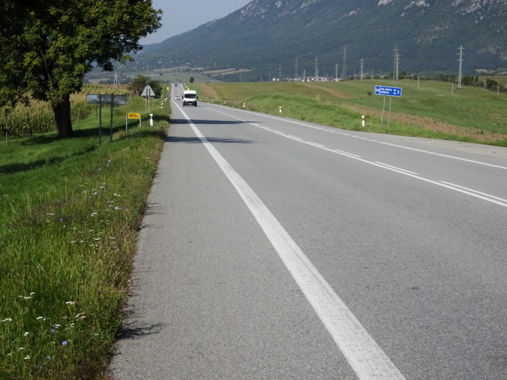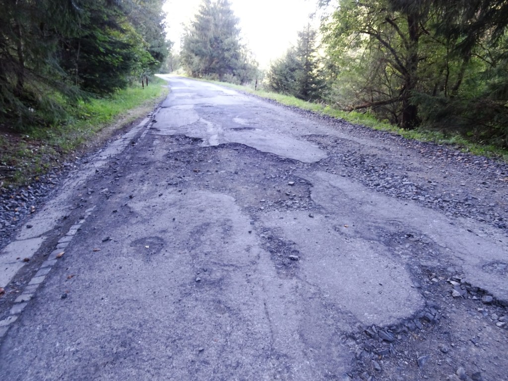 Oberhalb dieser Stelle war die Straße picobello erneuert und ich kieß es laufen. Der Wechsel kam abrupt und ich fuhr mit ca 30 km/h in diese Löcher. Außer dass es meine Lenkertasche aufgerissen hat, ist glücklicherweise nichts passiert. Diese relativ steile Abfahrt war über mehrere Kilometer kaputt. Es war aber die einzige so mangelhafte auf meiner Slowakei Route.