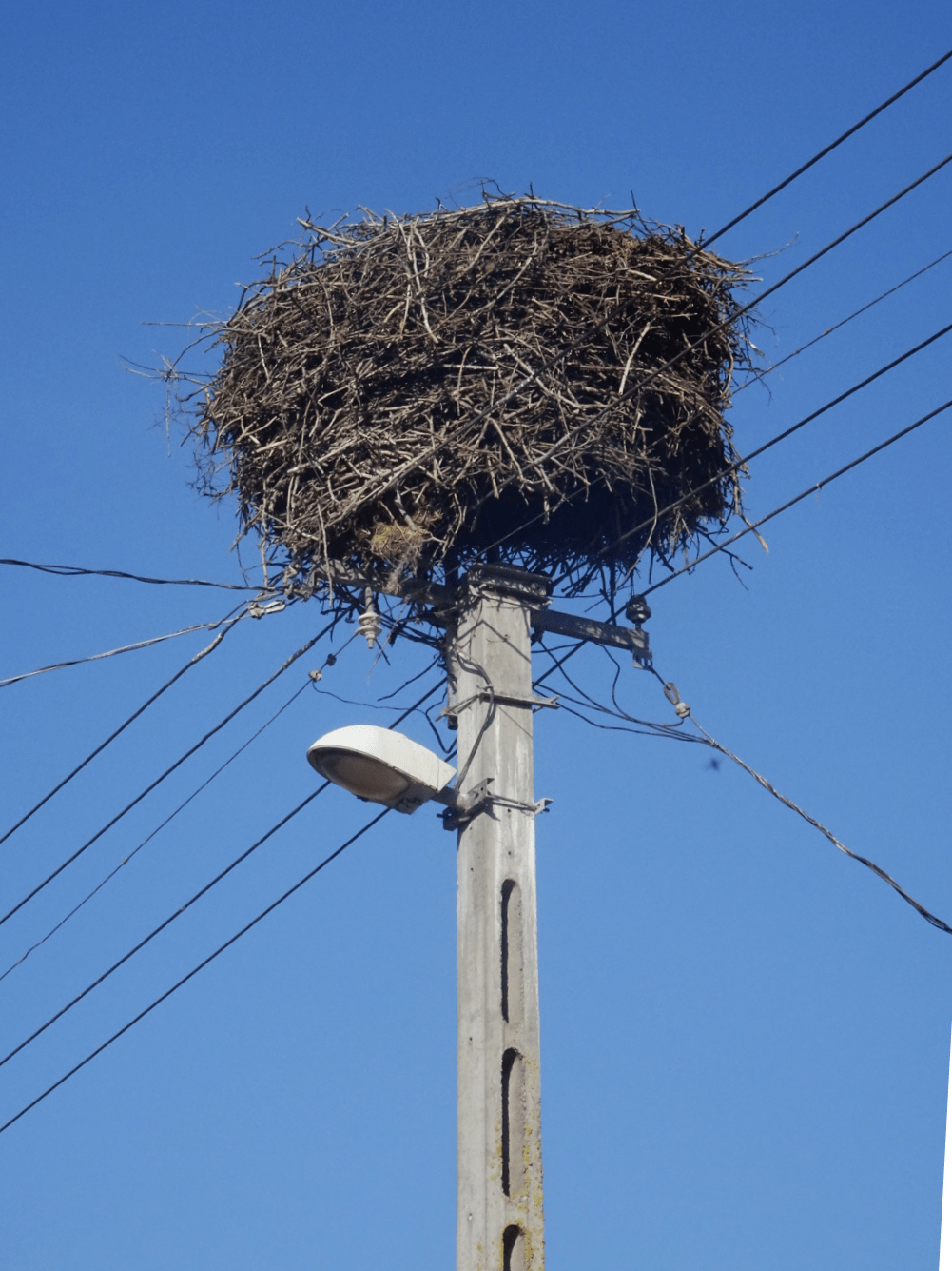 Storchennester auf den Leitungsmasten gibt es im gesamten Karpatengebiet. Die Störche beziehen nicht einfach ein bereits vorhandenes Heim, sondern es wird mit einer neuen Lage Zweige renoviert. In diesem Storchennest sind schon viele Storchenkinder zur Welt gekommen.