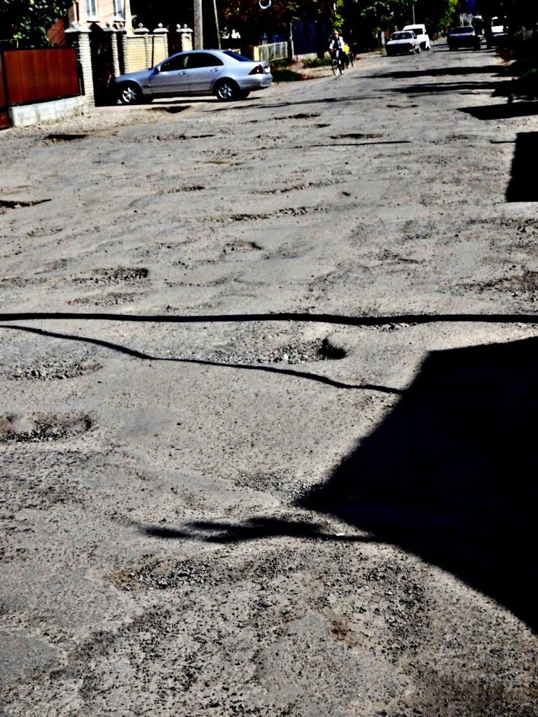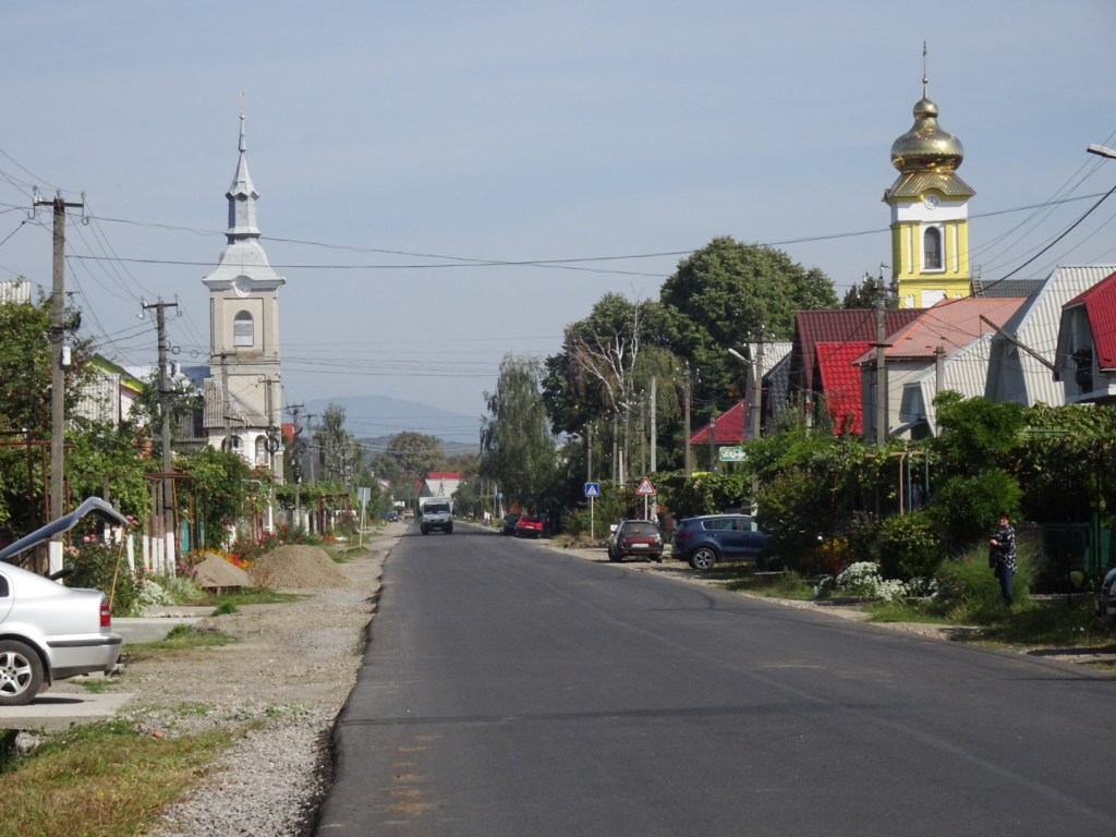 Ein typisches Dorf in der Ukraine, hier mit einer ungewöhnlich guten Straße. Natürlich die Kirchen. Es fällt auf, dass es wenig Autos gibt. Ein Zeichen für die Armut. Was hier fehlt, sind die vielen Fahrräder auf der Straße und die Menschentrauben an den Bushaltestellen. Wer sich kein Auto leisten kann, muss eben zu diesem Verkehrsmitteln greifen.