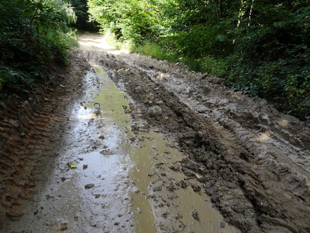 Waldweg mit tiefen Spurrillen, viel Schlamm und zum Schluss sehr steil in der Mitte eine 80 cm tiefe Kerbe rechts und links 30 cm Platz. Nur schieben! Auch abwärts musste ich mehrere Passagen durch den Schlamm schieben.