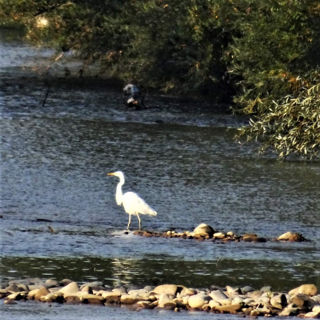 In der Theis fischt ein Silberreiher. Ihn sieht man in Deutschland wegen mangelnder alter Schilfbestände nicht so oft.