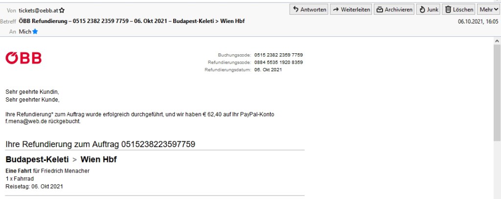 und ich habe noch am selben Tag ohne weiteres Zutun die Rückbuchung des Ticketpreises von Budapest nach Wien auf mein Paypal Konto bekommen. Das toppt doch alle Kulanz, die man sonst erfährt. Die DB sollte sich daran ein Beispiel nehmen. In Deutschland ist sowas unvorstellbar. Wenn überhaupt möglich, wäre mindesten eine Umbuchungsgebühr fällig gewesen.