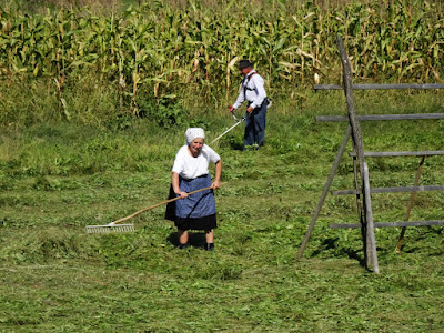 Heuen: Immerhin hat er eine Motorsense. In diesem Alter ist das angebracht. Das Heu wird von Hand gewendet. Gearbeitet wir in absolut sauberer Kleidung, Getopt vom weißen Hemd/Bluse. So pikfein bin ich nicht in meinem Garte