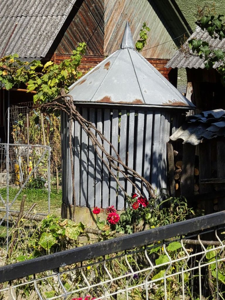 Eigene Brunnen haben viele Häuser, hier im Iza-Tal fast jedes. Sie sind immer abgedeckt. Mit einem großen Handrad – hier nicht sichtbar – wird eine Welle gedreht, an der ein Seil mit Eimer befestigt ist. Die meisten Brunnen sind zumindest für die Trinkwasserversorgung nicht mehr in Betrieb. Lediglich in den Klöstern kann man hier noch Wasser schöpfen. Immer hängt ein Trinkbecher am Gebälk, mit dem aus dem Eimer getrunken wird. Die heilige Umgebung sorgt für die Hygiene!?