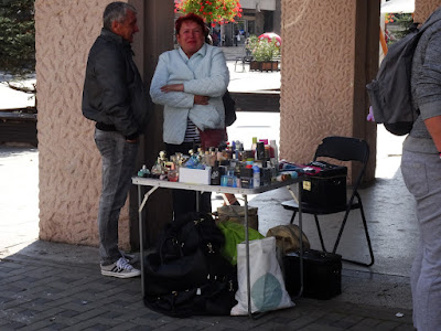 Die Parfümverkäuferin. Dieser Betrieb kommt mit minimalem Kapitaleinsatz aus. Nach dem Foto kommt sie zu mir und sprüht eines ihrer Duftwässerchen auf meinen Arm. Ich meine, Wasser wäre wichtiger. Sie kann mir aber nicht sagen, wo ein Waschsalon in Campulung Moldovenese ist. Ich finde keinen und fahre weiter mit völlig verschwitzter Kleidung.