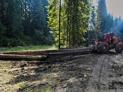 Hier wird geklotzt. Pferde haben bei der Forstarbeit ausgedient. Gesägt wird auch mit Stihl. Der Gegensatz zu den übrigen hier dargestellen Arbeiten ist krass.