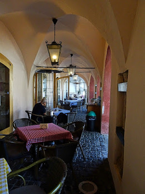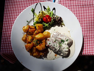 Es ist Sonntag 12 Uhr. Mein Magen meint, er hätte schon lange nichts Gutes mehr bekommen. Also verschiebe ich meinen Sitzplatz um 5 m auf einen Restaurantstuhl und bestelle. KEINE Pizza, ein rumänisches Essen. Hackfleischrollen mit Pflaumen-Käse-Füllung, Rosmarinkartoffeln und Salat. Es schmeckt gut aber in einen Radlermagen passt locker die doppelte Portion.