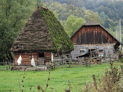 In einem Tal der Südkarpaten steht dieses Haus. Typisch für relativ steile Hänge ist das gemauerte Untergeschoss. Es beherbergt meistens Ställe und Keller und ist von der Talseite zugänglich. Das Obergeschoss ist aus Holz und von der Bergseite zugänglich.
