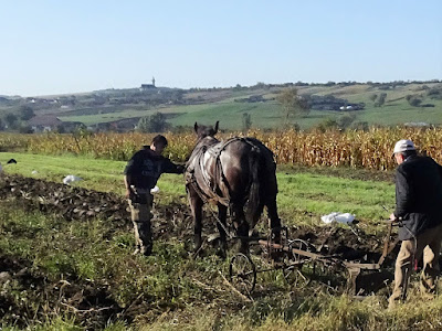 Auch eine Überraschung: Pflügen mit dem Pferd. Das ist wohl selbst in Rumänien selten. Ich sehe hin und wieder auch kleine, ältere Traktoren. Die ersetzen die Pferde bei der Feldarbeit. Die Kolchosenachfolger arbeiten kapitalintensiv mit