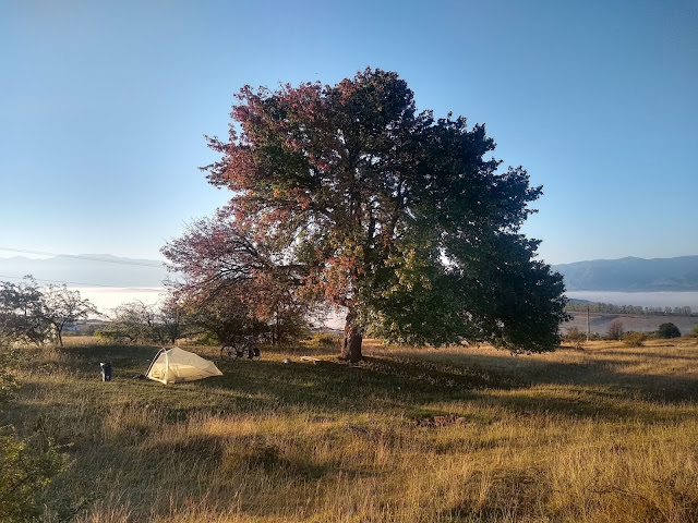 Aus dem Schlafsack krabbeln und so einen Morgen an diesem Platz erleben: das ist eine Wucht. Da kann nicht einmal das klatschnasse Überzelt die Laune verderben. Solche Momente sind es, die mich süchtig nach dem Radeln machen.