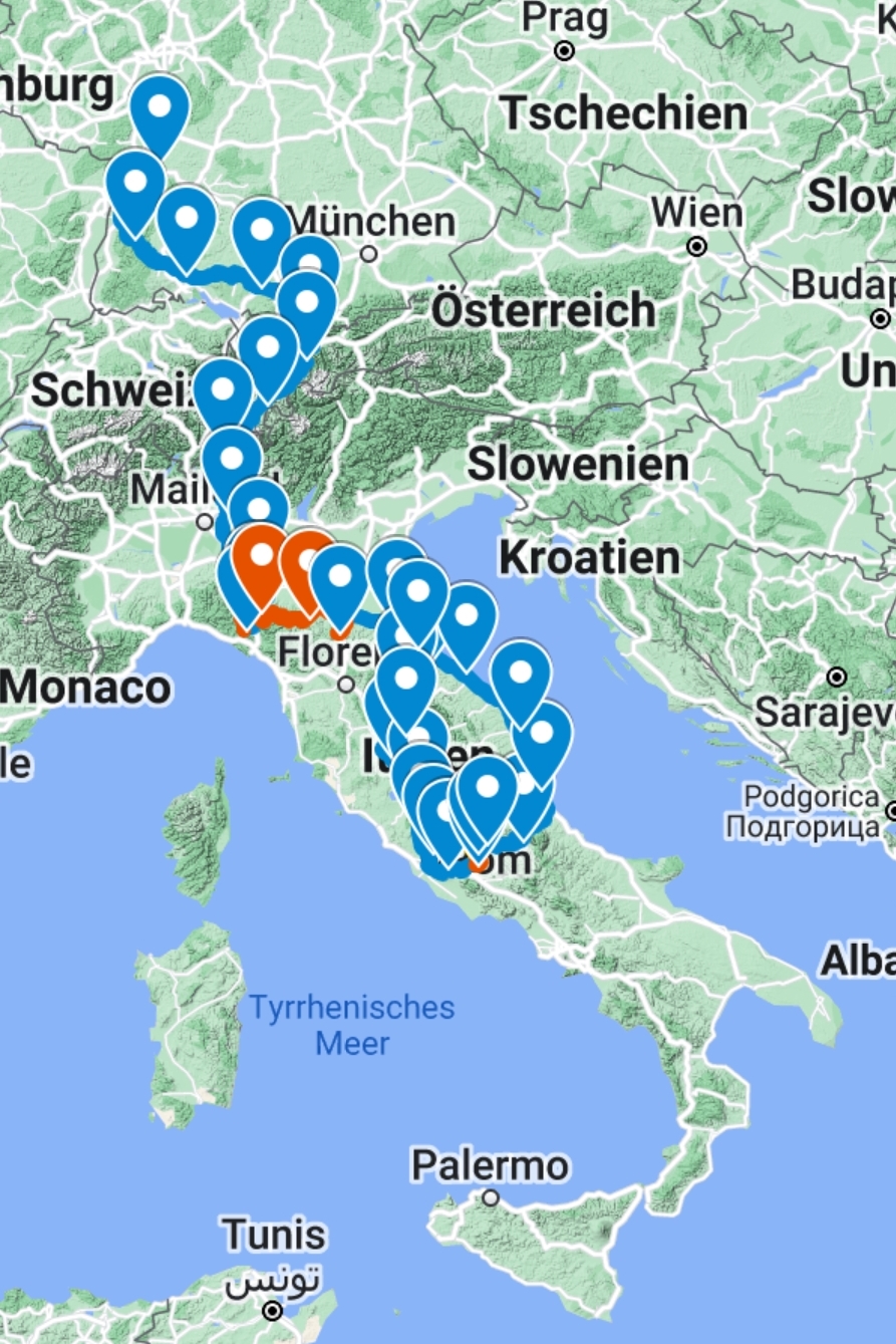 Fahrt des Regens und der StürzeWechsel blau-rot = Hin- und Rückfahrtgelb = besonders schöne Strecke
