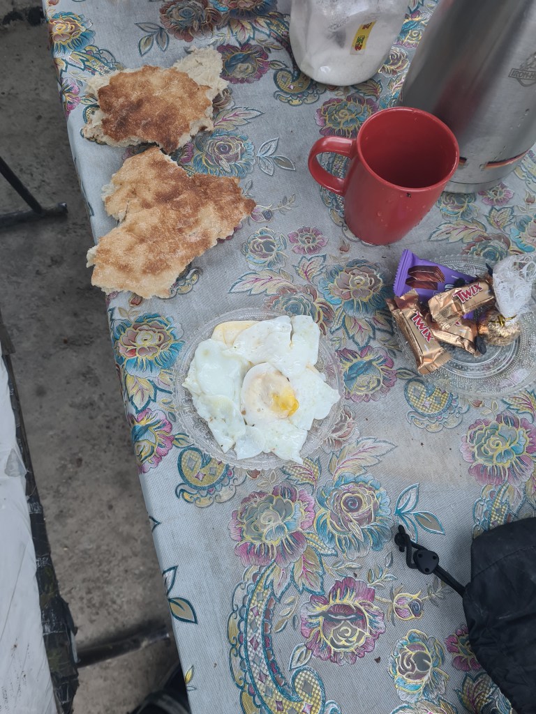 Natürlich gab es Tschai – gut – und Sweets, Twix, einzeln verpackte Schokokekse, Rosinen, mmm, und türkischen Nougat, mmmm. Dazu Fladenbrot, so trocken, wie es noch nie in meinen Radtaschen war. Der Hunger treib’s rein.