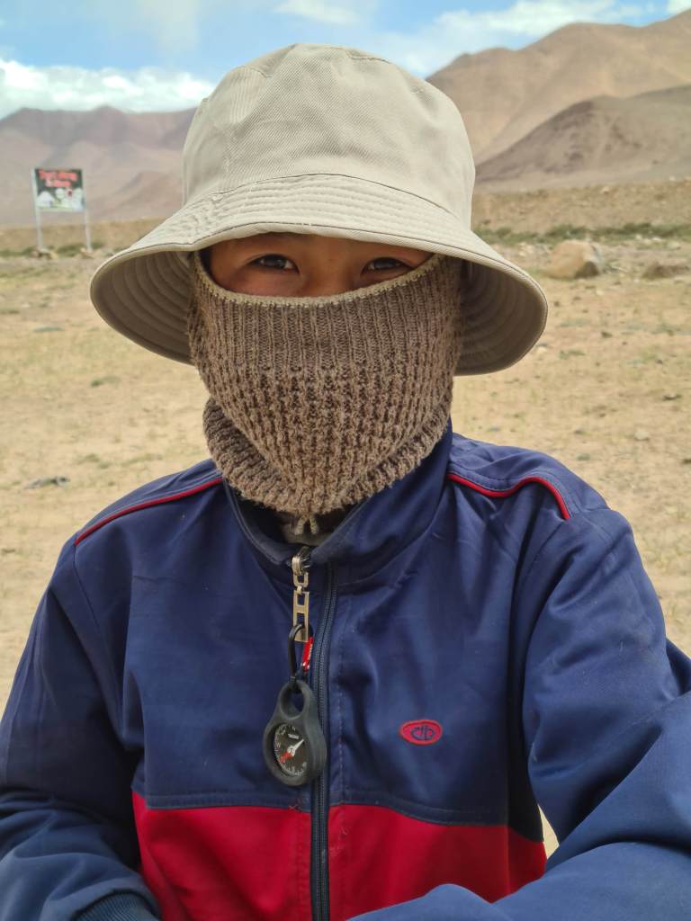 Der kirgisische Junge hat sein Gesicht vor den Fliegen geschützt. Das machen alle Hirten, auch die Tajiken. Er lud mich zu einem Tee ein, aber ich wollte weiterfahren.