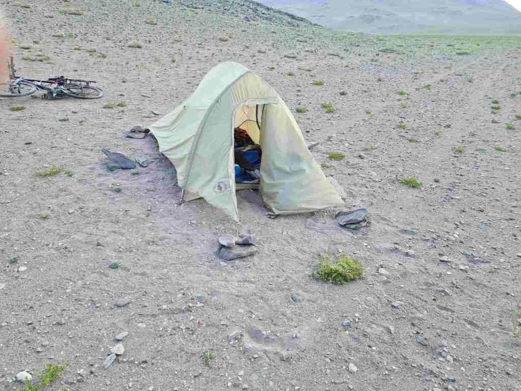 Nicht viel später kam ein heftiger Sturm auf. Eine Bö hätte mich beinahe vom Rad geblasen. Es war sinnlos, unter diesen Bedingungen die Fahrt fortzusetzen. Im Schutz eines kleinen Hügels baute ich mein Zelt auf. Die Steine verhindern, dass der Wind die Häringe herausrüttelt.