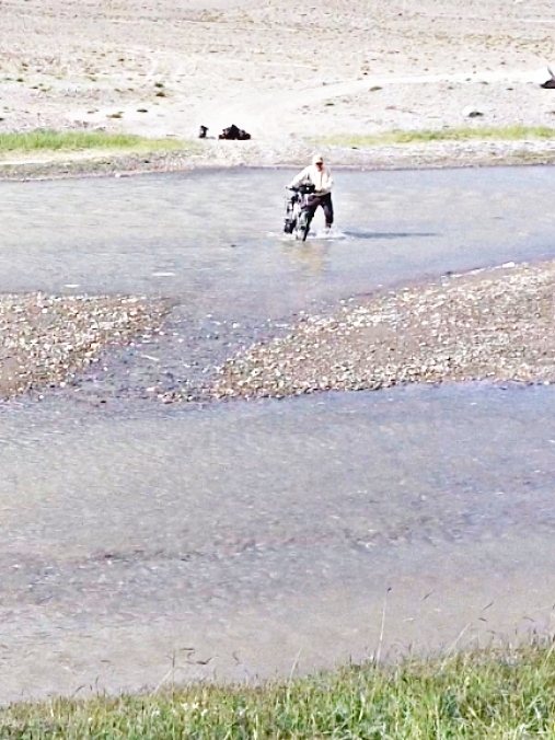 Ich bin 4 Stunden abgestiegen, habe mein Zelt abgebaut, gepackt und bin losgefahren. Nach wenigen Kilometern war diese Furt zu queren, über die wir schon in Murghab diskutiert hatten. Es war leicht. Nur an einer Stelle war sie knietief