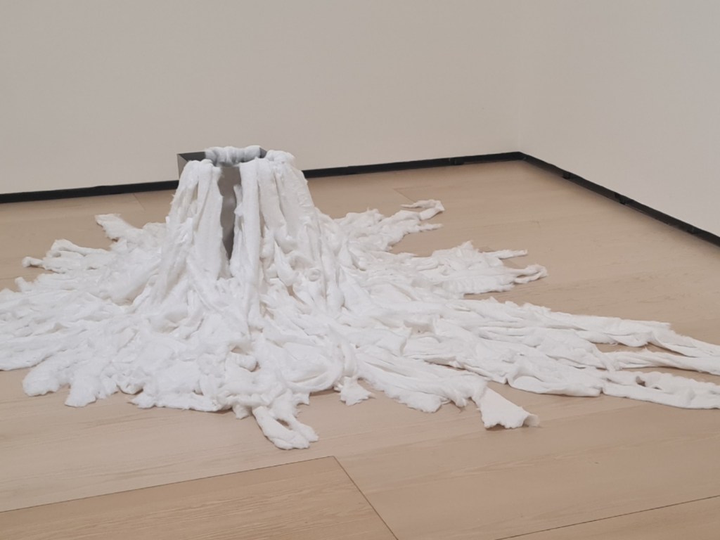 Hier fließt aus dem öffentlichen Abfallbehälter weißes Vlies heraus. Es sieht aus wie der Reisbrei aus dem Schlaraffenland, der den Zugang fast unmöglich macht.