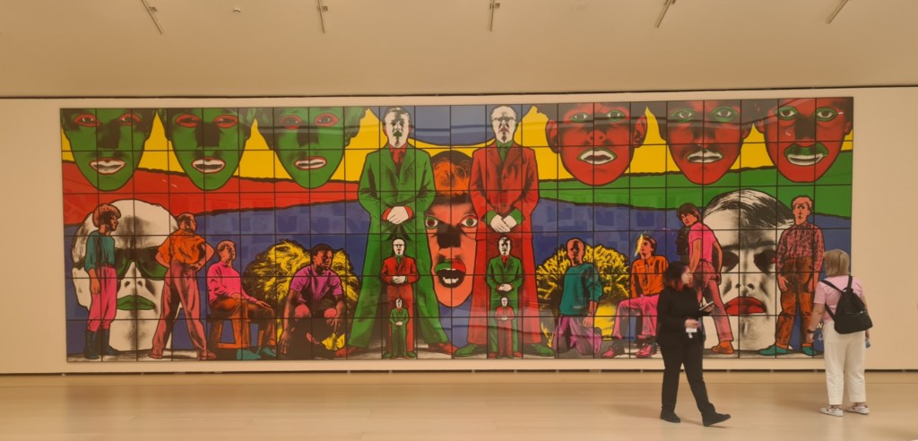 Die Roten und die Grünen einerseits und die Weißen andererseits stehen sich hier gegenüber. Die Roten und die Grünen knien, hocken und stehen, soweit ich das sehe, ohne Hierarchie. Keiner steht über dem Anderen. Die weißen haben eine Hierarchie. Unter den großen stehen die mittleren und darunter die kleinen Weißen. Außerdem scheinen die Weißen auch die Roten und die Grünen aus dem Hintergrund zu überwachen. Das ist eine harte, weltweite Kritik an der weißen Gesellschaft. Man kann natürlich fragen, ob die Roten und die Grünen wirklich ohne Hierarchie auskommen, denn m. E. gibt es in allen Ländern eine Hierarchie. Die hierarchilose Gesellschaft ist sicherlich ein Wunschtraum.