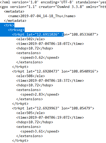 Dies Datei wurde mit dem Osmand Tacker erstellt. Für jeden Punkt sind außer den Koordinaten und der Höhe noch die Zeit, ein Gernauigkeitsmaß Hdop und eine Geschwindigkeit angegeben.