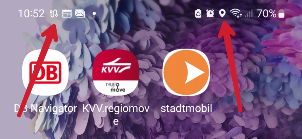 Das Routensymbol wird auf dem Android Startbildschirm oben links dargestellt, auch wenn Osmand nur im Hintergrund läuft, d. h. nicht sichtbar ist. Oben rechts wird die Standortbestimmung angezeigt. Falls es nicht sichtbar ist, auf Androidebene: